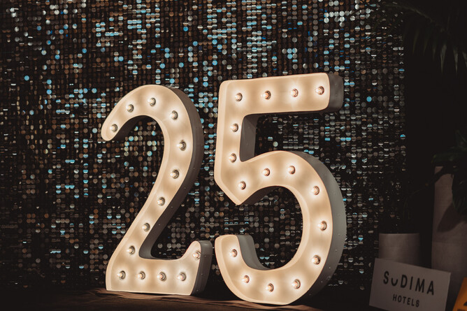 The feature photo wall – an eye-catching silver sequin panel wall with illuminated numbers – set the stage for memorable moments, while custom Sudima handheld signs added a fun, branded twist.
