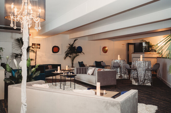 To complement the high-energy celebration, we created a serene chill-out lounge in a separate room. With soft lighting, plush cushions, and modern lounge furniture, it offered guests a welcoming space to relax while listening to live music.