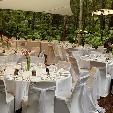 Tucked into the Whakarewarewa Forest, our ‘Under the Sails’ venue is a unique outdoor space nestled beneath the towering Redwood trees.